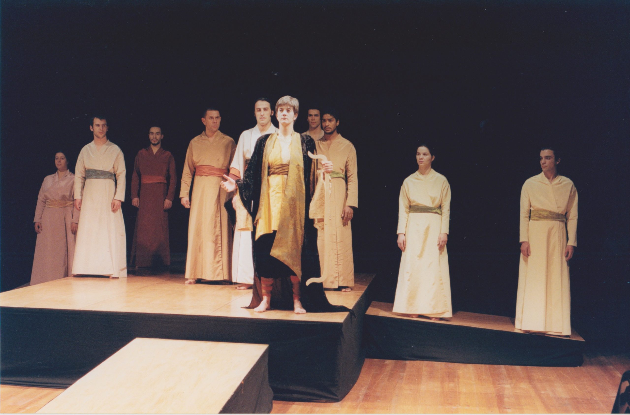 Esta diferença implicou alterações na preparação deste espectáculo. A construção assentou num processo formativo alargado onde, com o nosso elenco fixo, participaram quatro estagiários que já estiveram no último ano na companhia (e aqui fazem outro complemento prático) e quatro outros, de origens diferenciadas, do teatro escolar (universitário e secundário), a grupos semi-profissionais e ainda um actor do Elinga-Teatro, companhia angolana com a qual A Escola da Noite tem um protocolo de colaboração. Todos integram um coro onde reside o pulsar afectivo, reflexivo e trágico desta obra fundadora.